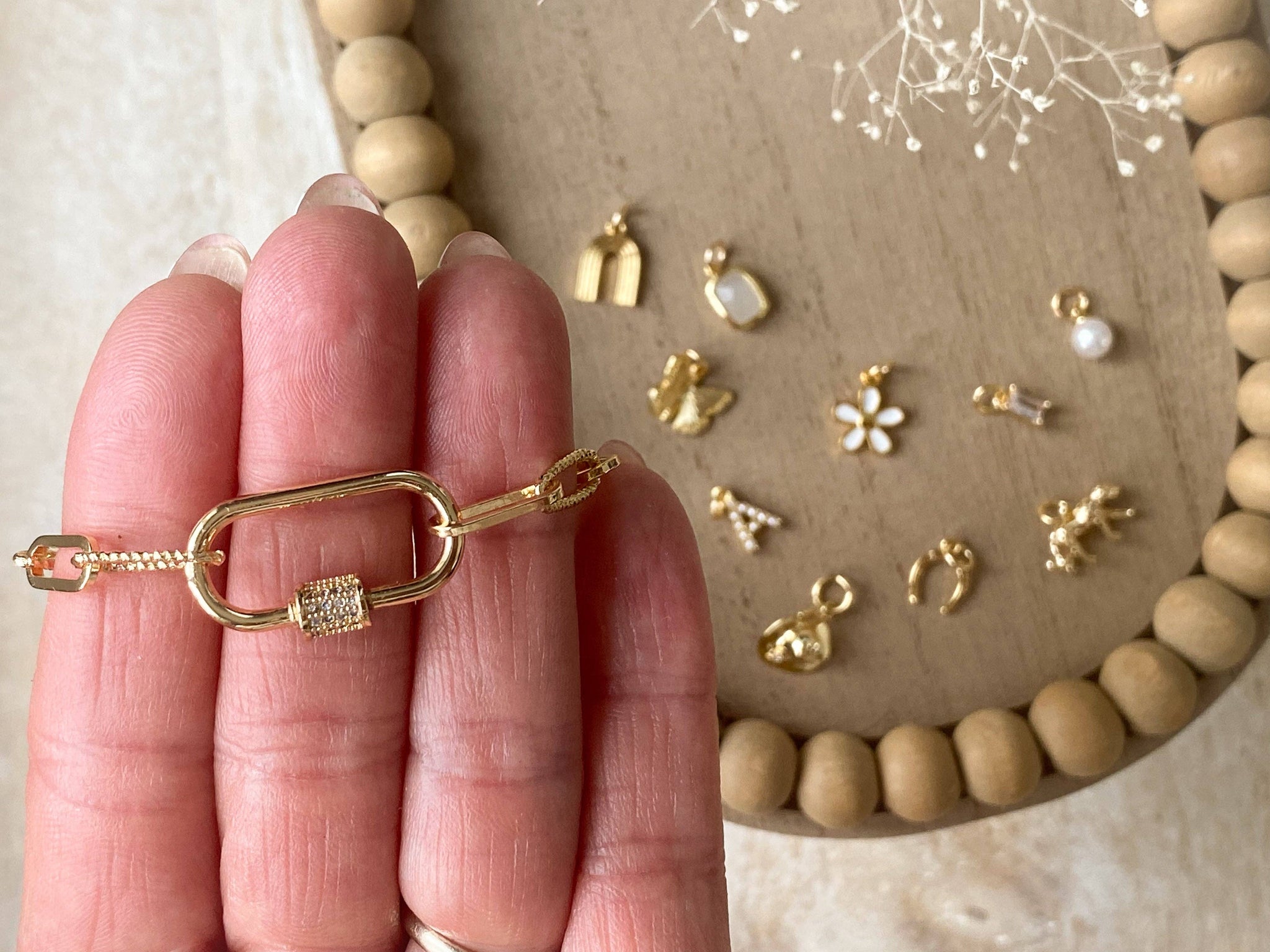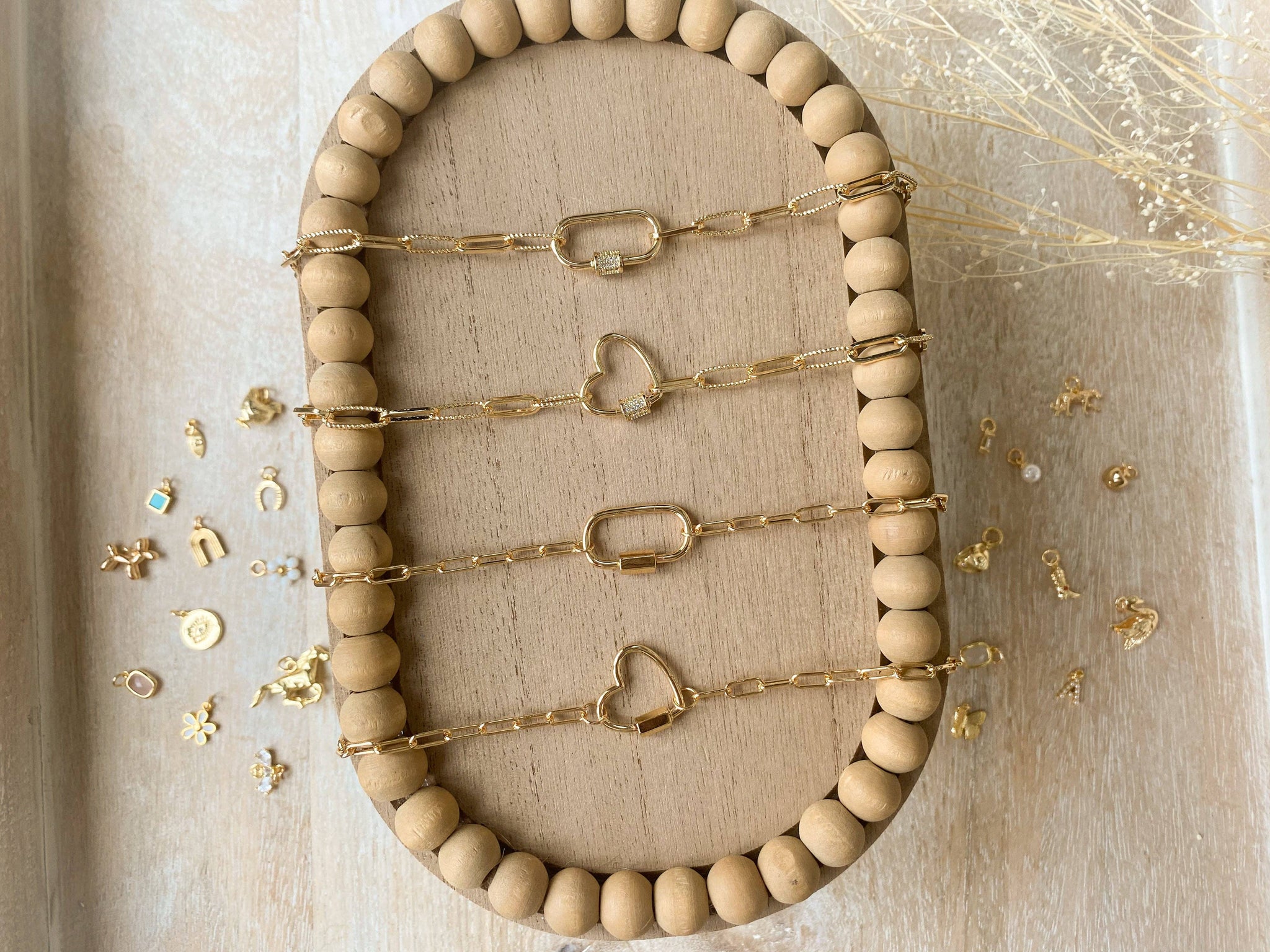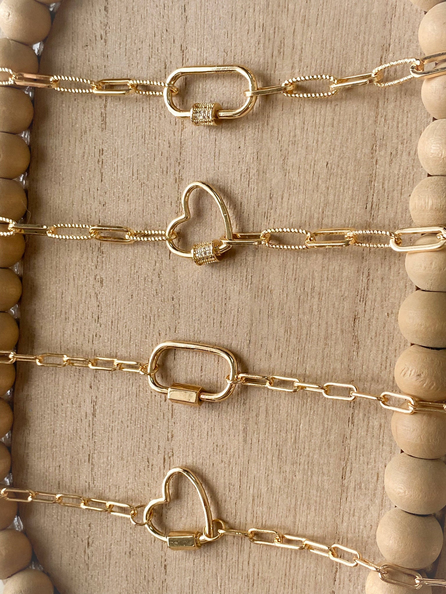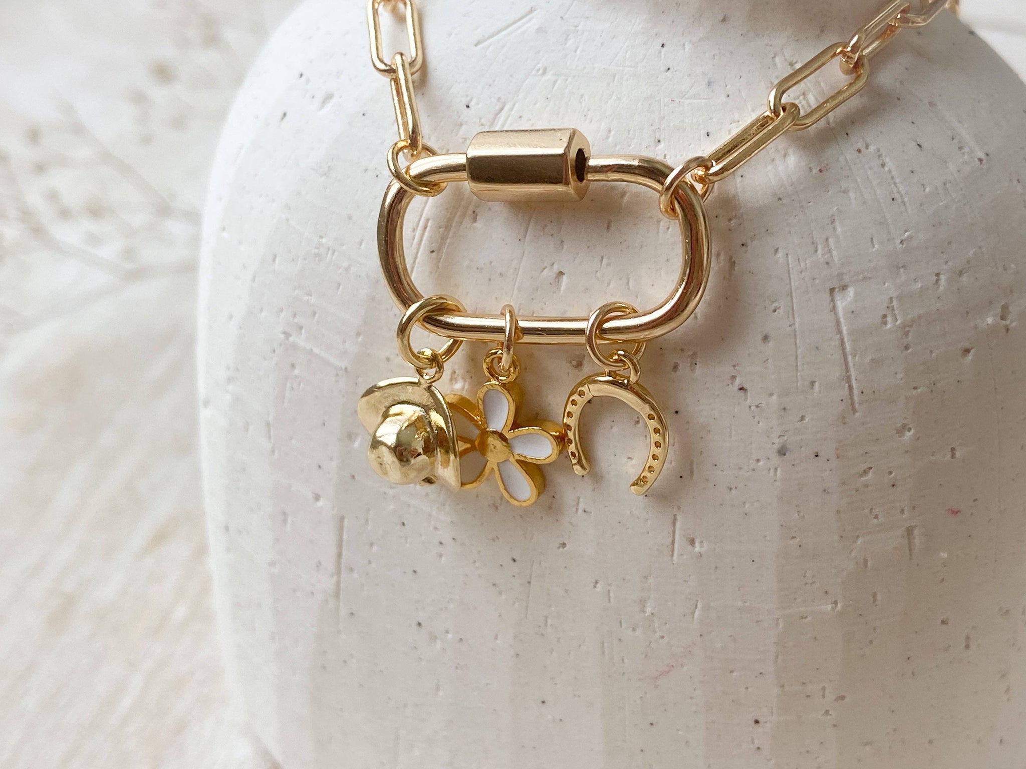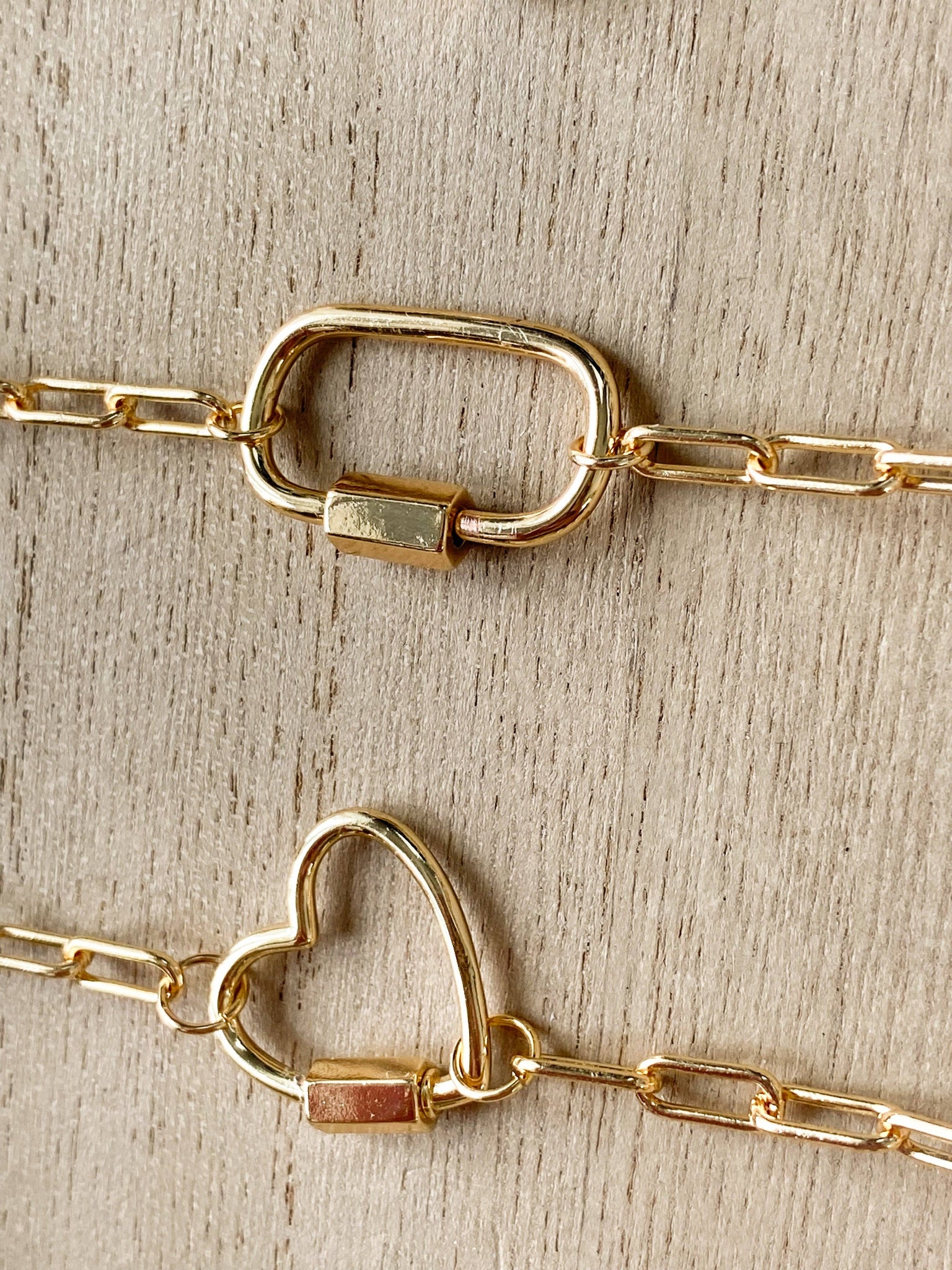 Join the trend with our new Carabiner Necklace made from paper clip chain. Designed for versatility, wear it solo for a sleek look or customize it with charms to match your mood easily added or swapped at any time. Choose from either a textured chain with a cubic zirconia carabiner closure or a smooth chain with a simple carabiner closure. All necklaces are crafted with tarnish-resistant gold plating for lasting shine. Charms sold separately. 17 inches in length