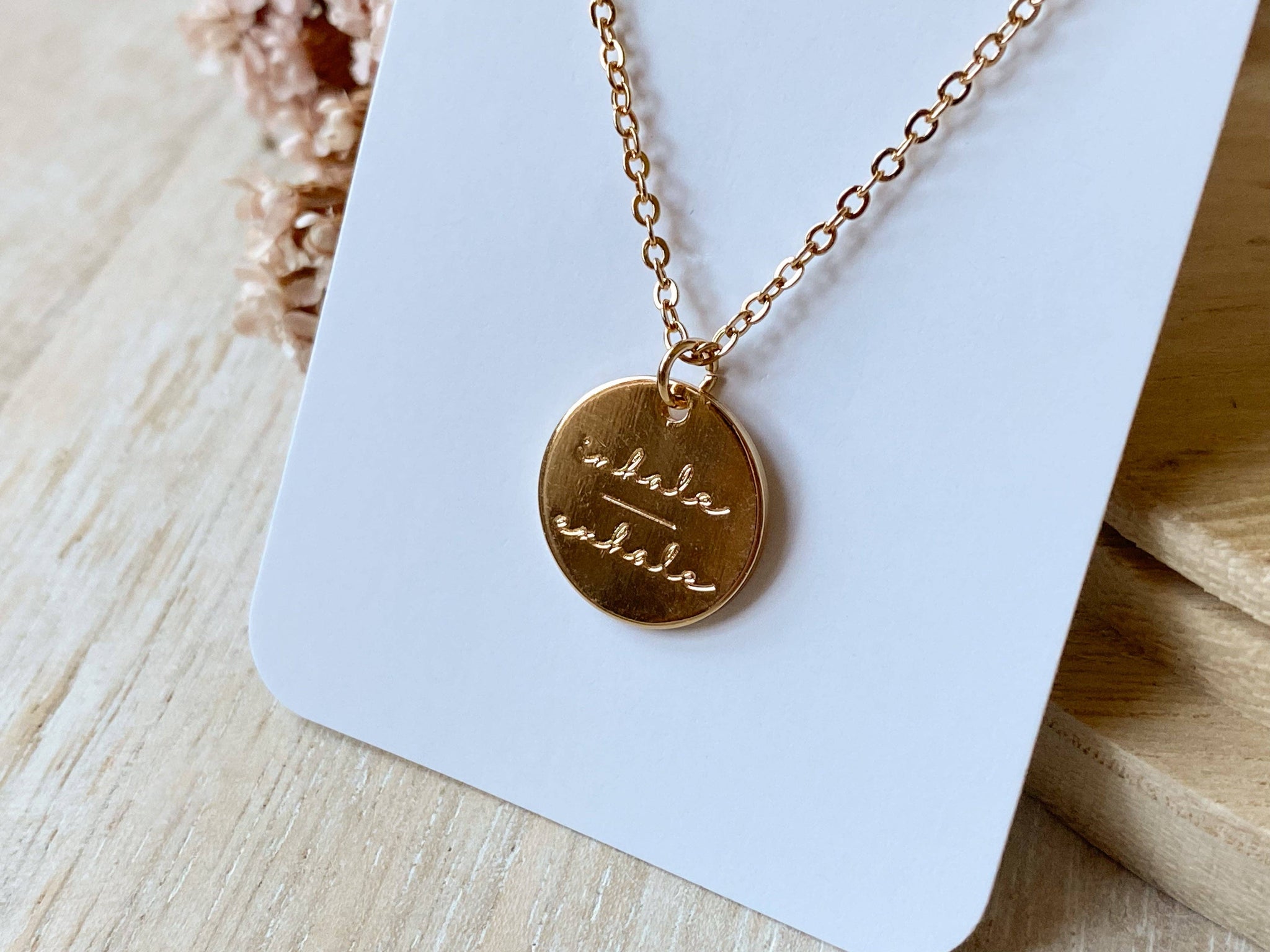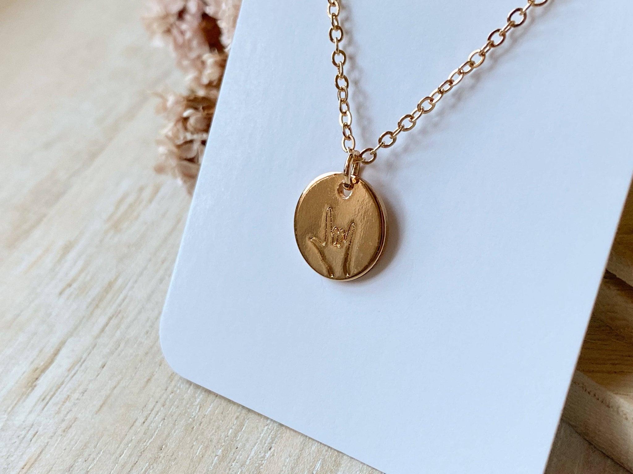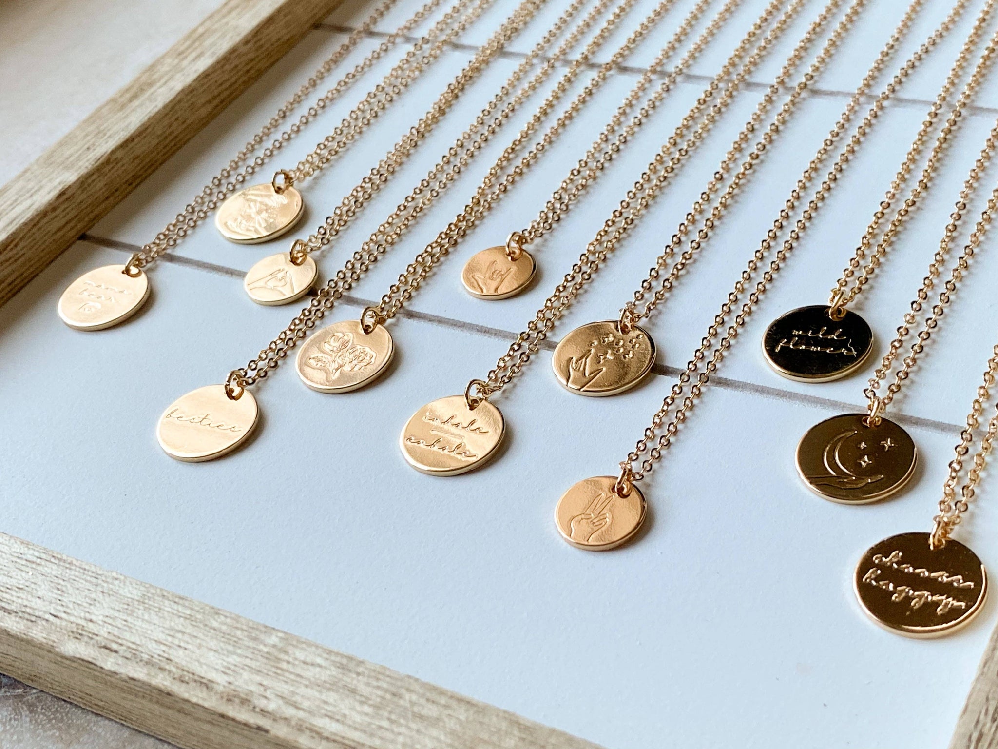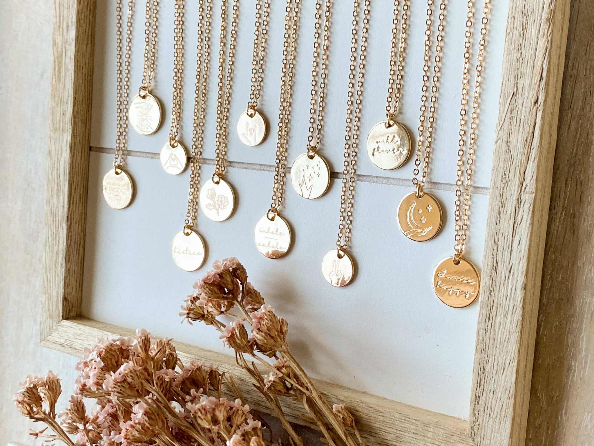 These necklaces are all so fun! There are 15 different styles to choose from and are all 18" with an extension to adjust 1-2". Each necklace is gold plated and either has words, hand signs, or designs engraved into them. These are perfect for layering with another simple necklace or wearing alone as a statement piece.