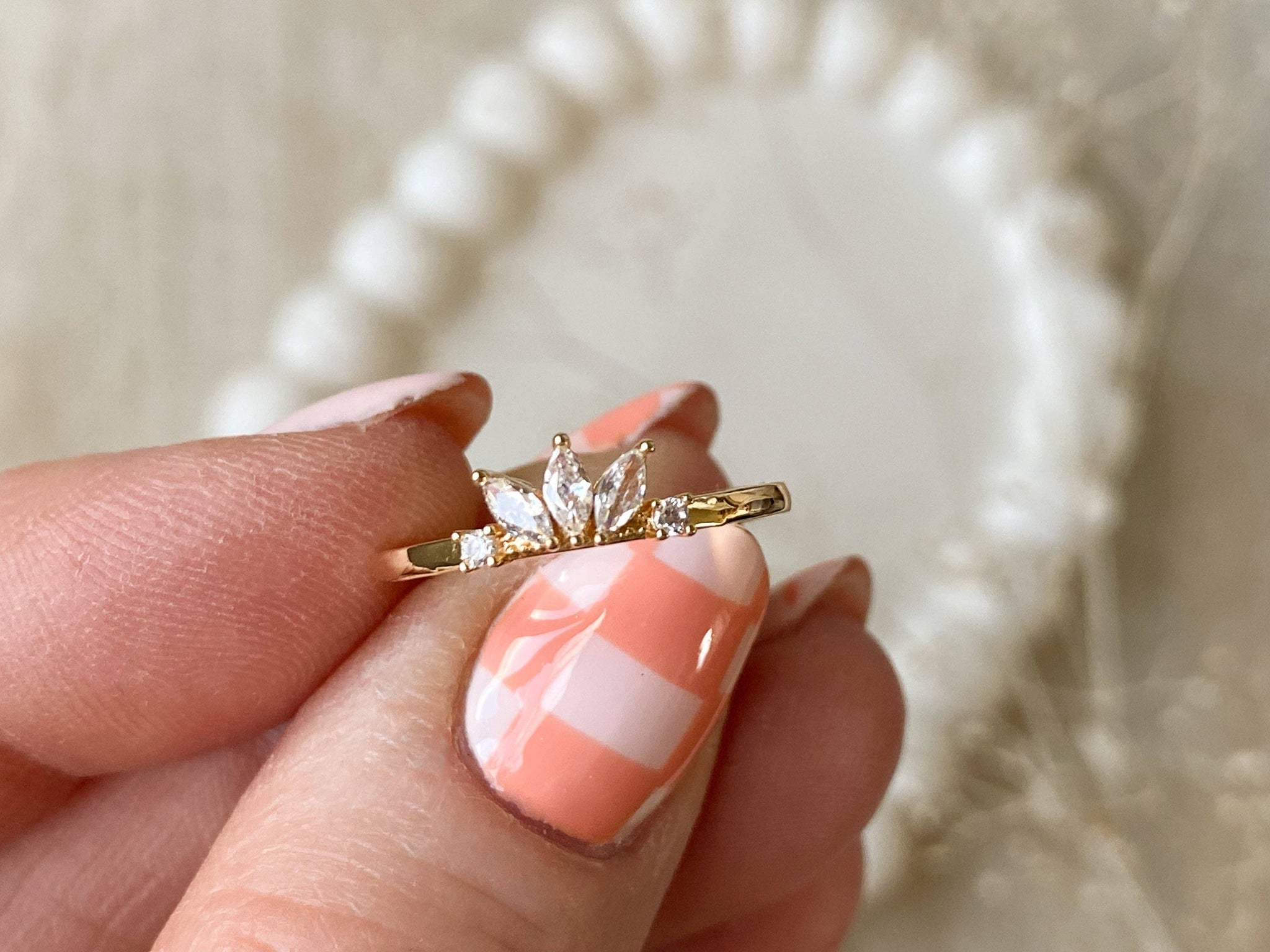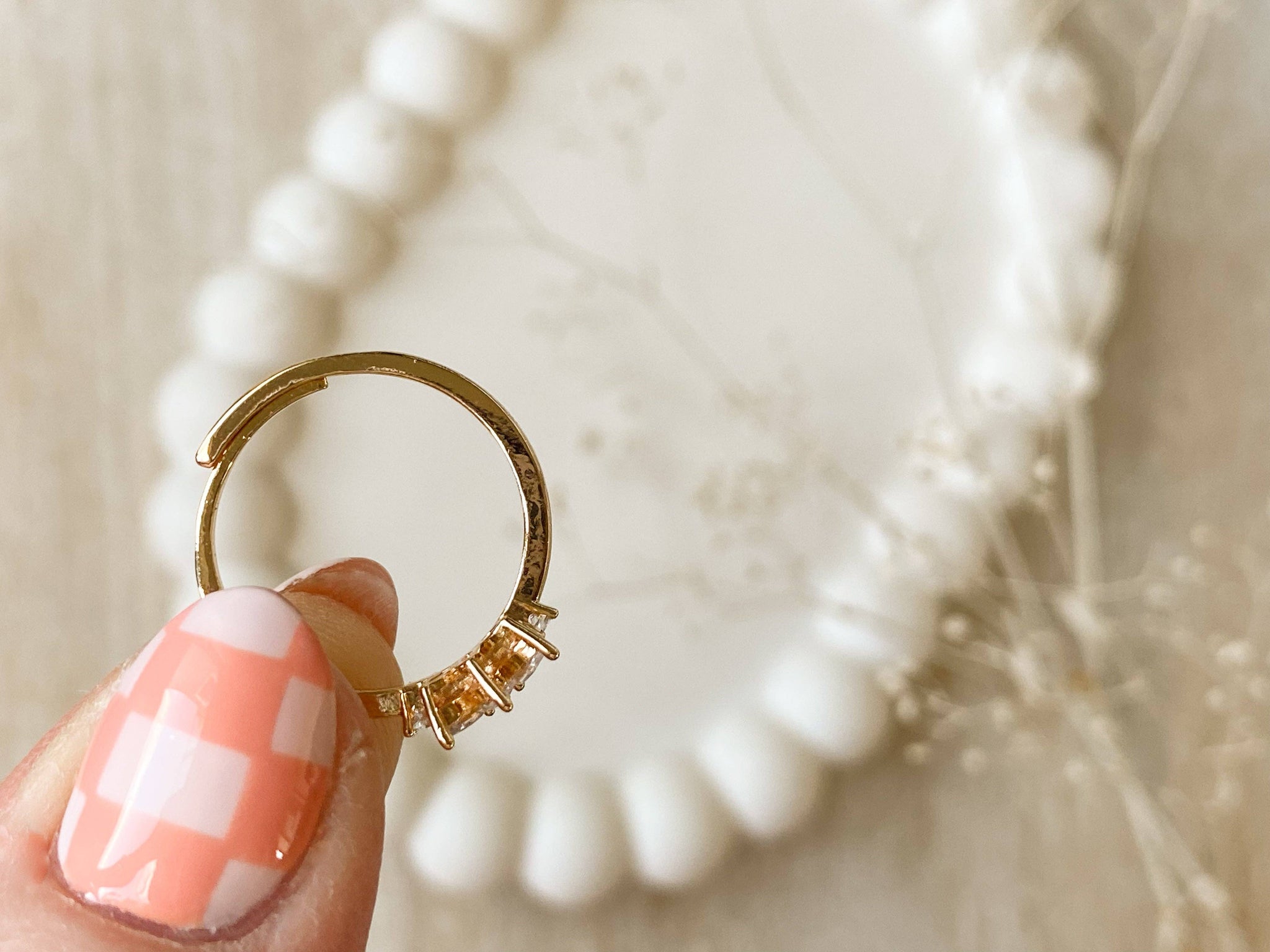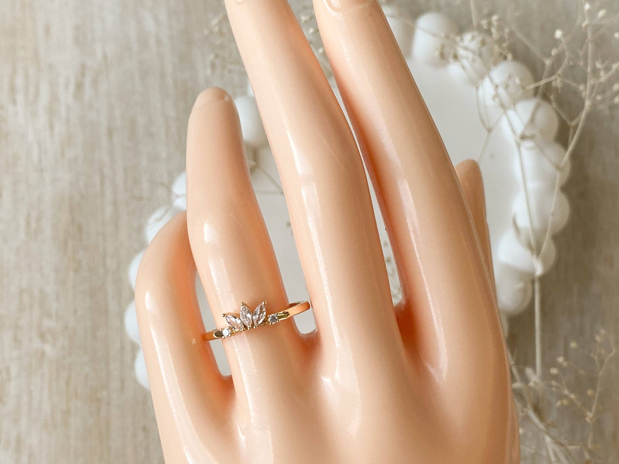 An adjustable Cubic Zirconia ring with three marquis stones and 2 brilliant round stones. This would be stunning alone or paired with a solitaire ring.